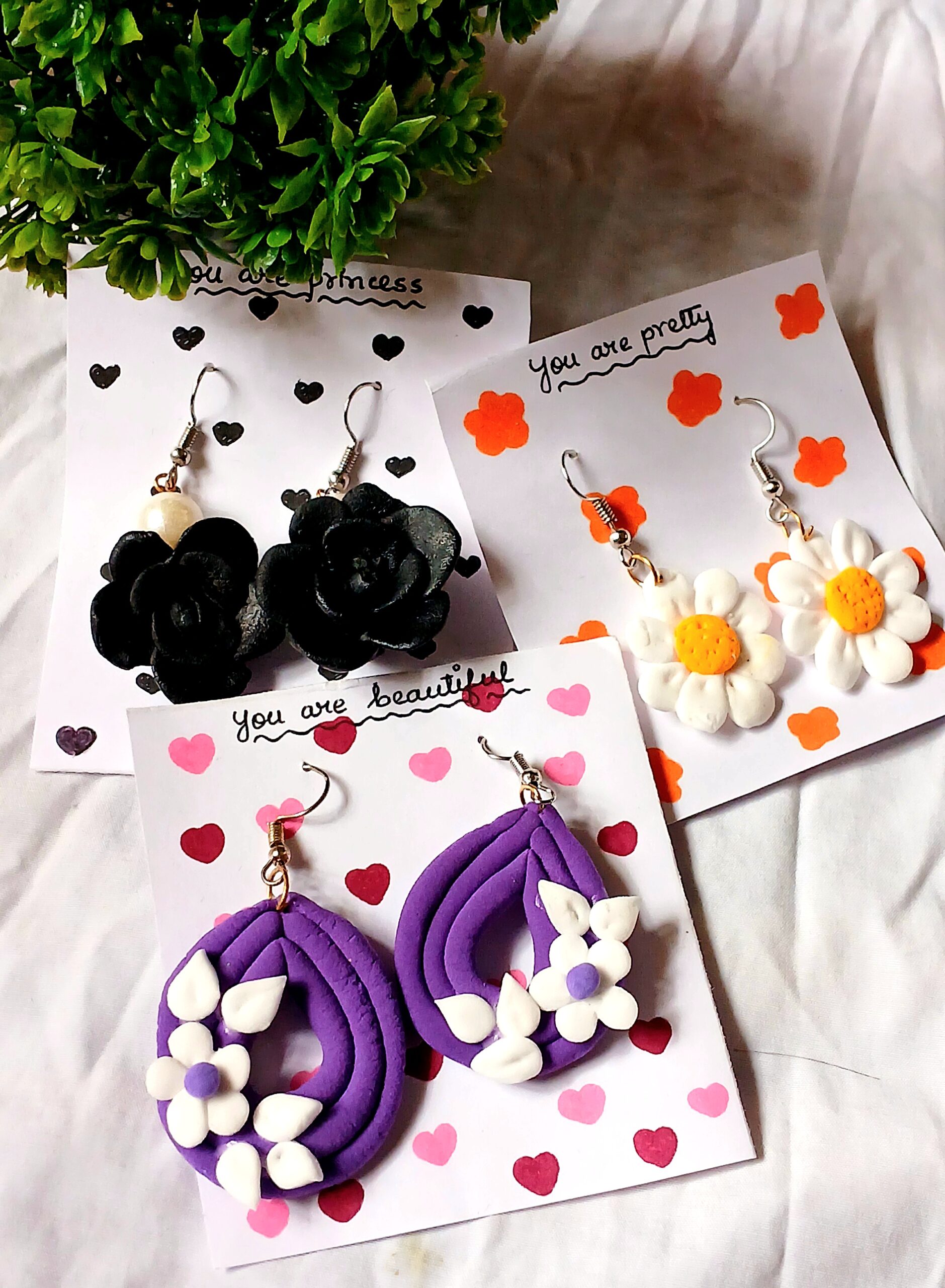 This product consists of 3 beautiful & aesthetic clay earrings ideal for gifting or ethnic casual dailywear use. Customization available. In that case plz mention the required customization in details in the address section.