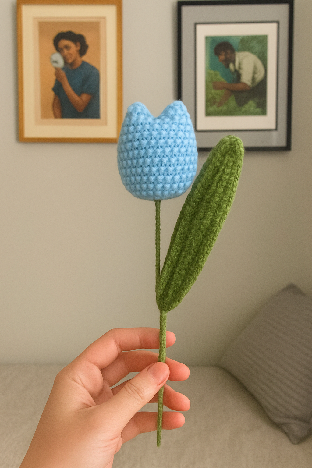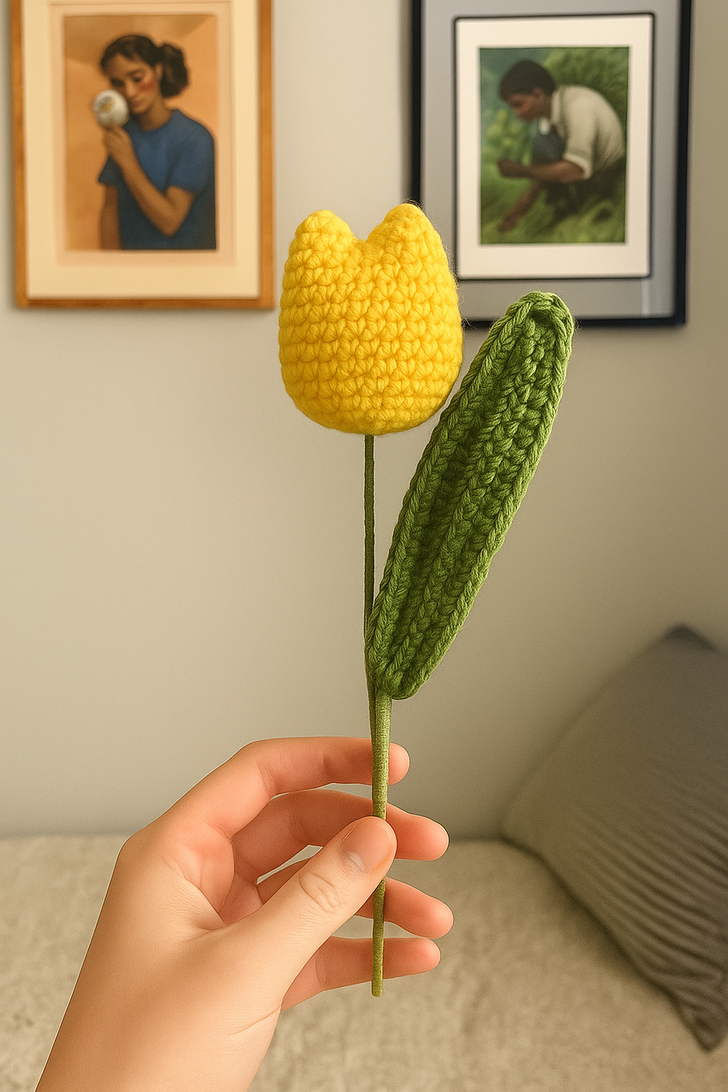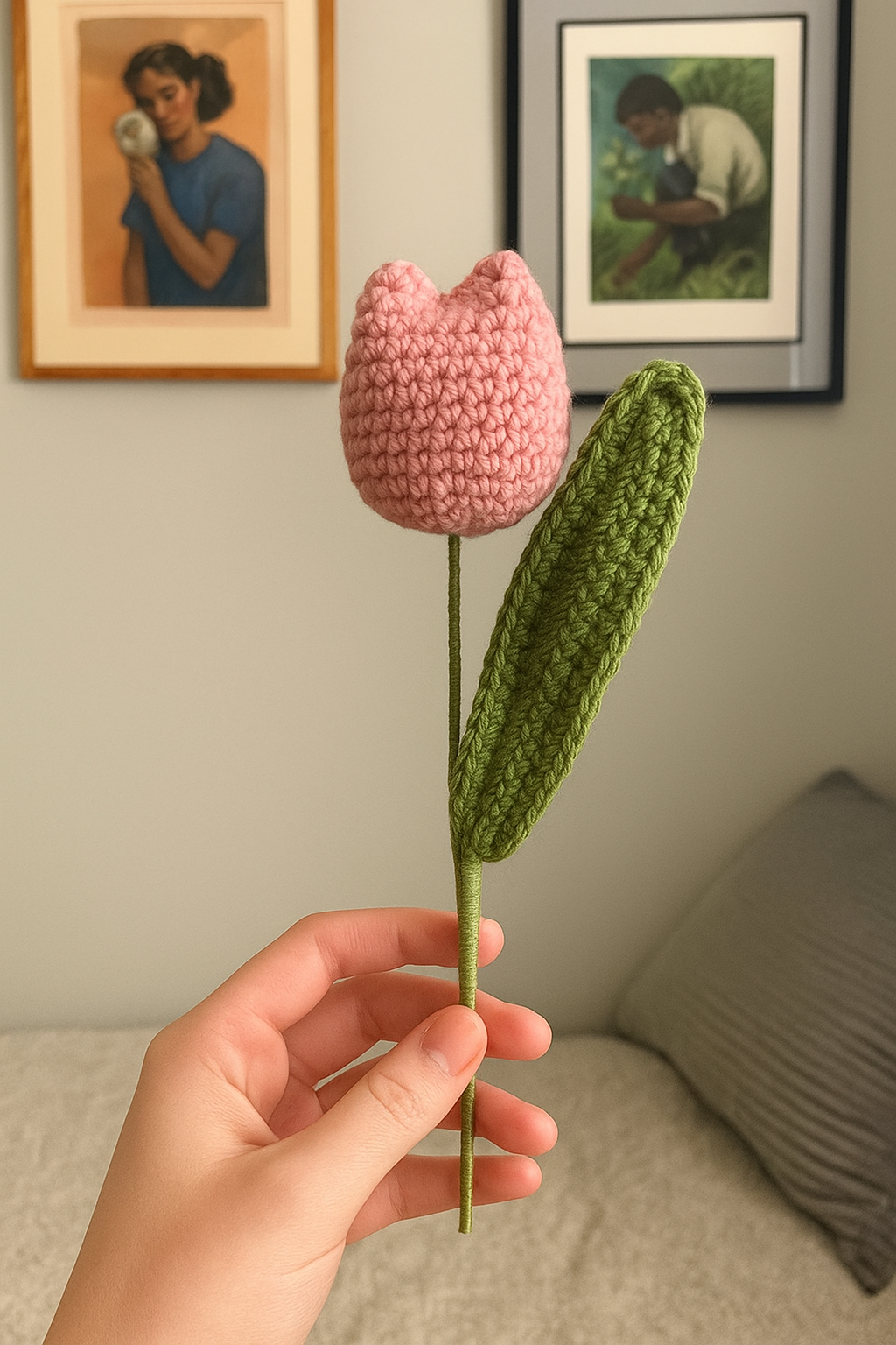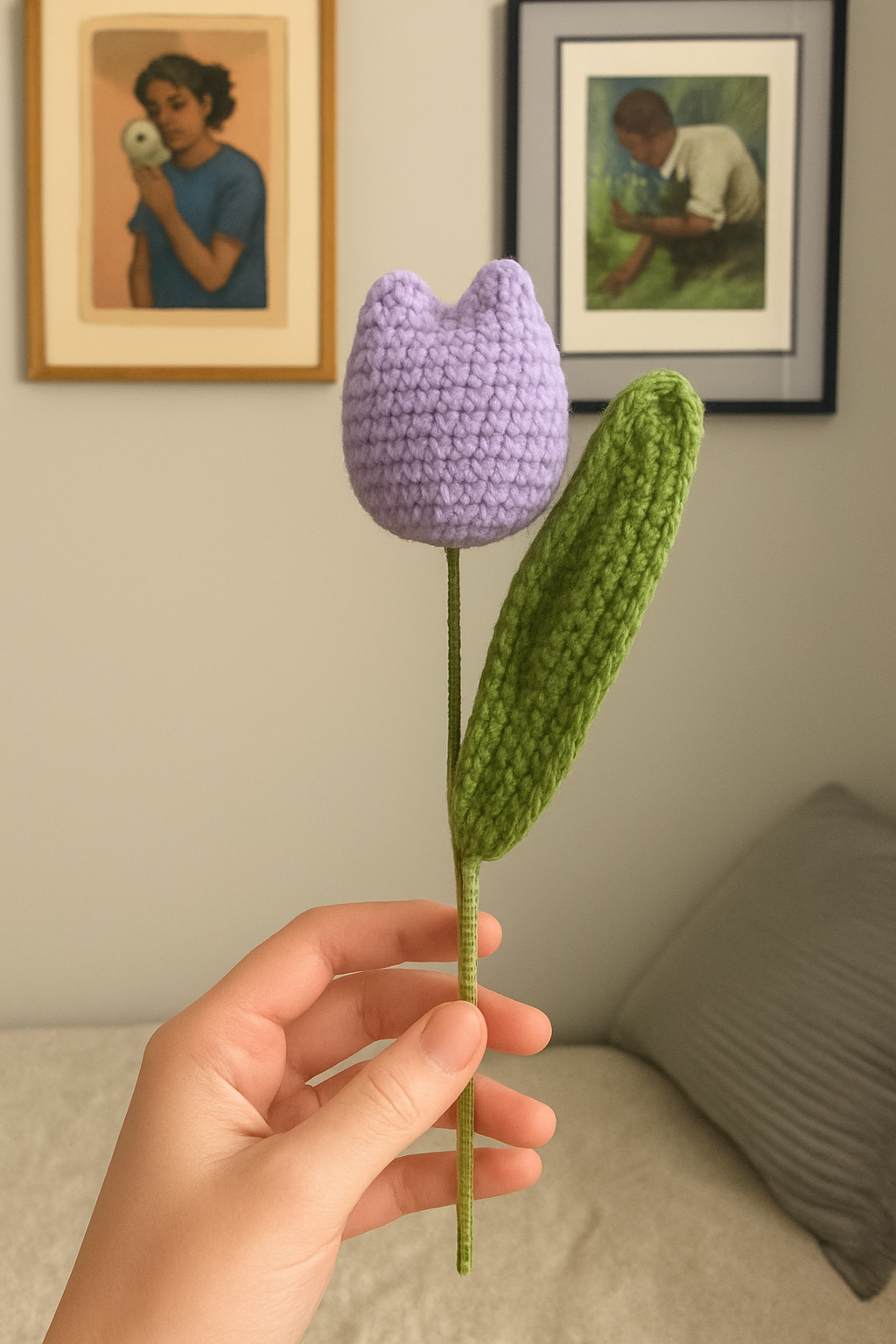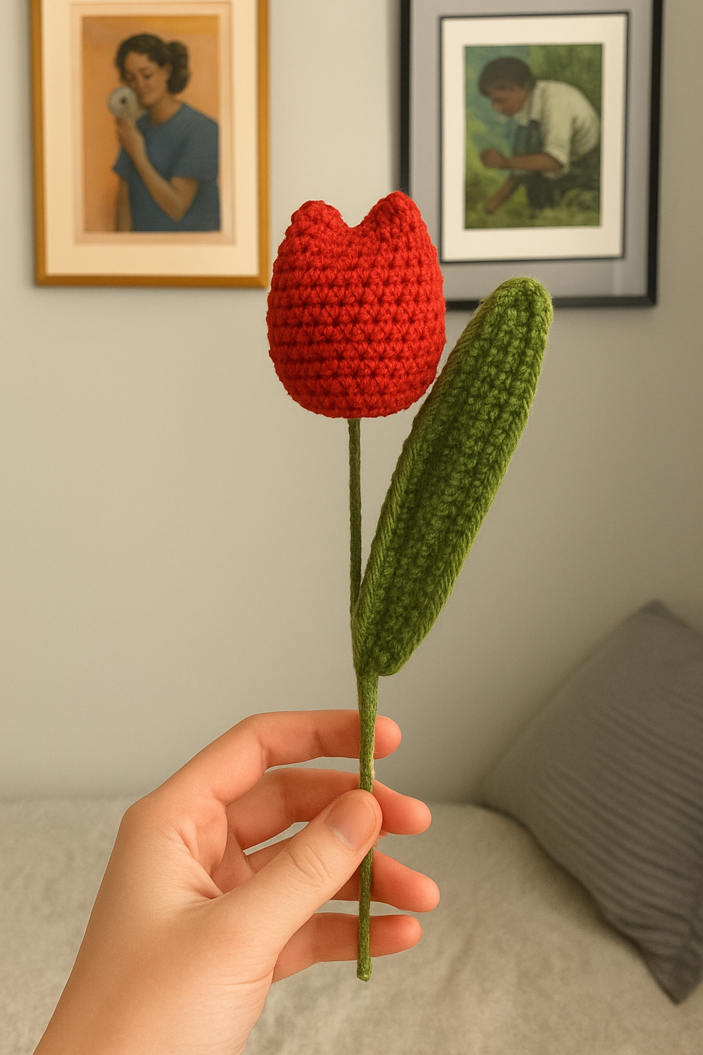 Embrace the everlasting beauty of spring with our exquisitely handcrafted crocheted tulip. Meticulously made with soft, high-quality yarn, this charming floral creation captures the delicate elegance of a fresh tulip, but with the added benefit of never wilting. Each individual petal and leaf is carefully crocheted and thoughtfully assembled, resulting in a lifelike and durable piece of art. Whether adorning a desk, brightening a bookshelf, or adding a touch of warmth to a bedside table, this crocheted tulip offers a maintenance-free burst of color and joy. It’s an ideal gift for flower lovers, a unique centerpiece, or a lovely way to add a touch of handmade charm and perpetual springtime cheer to your own home or office decor. Enjoy the beauty of nature, forever in bloom.
