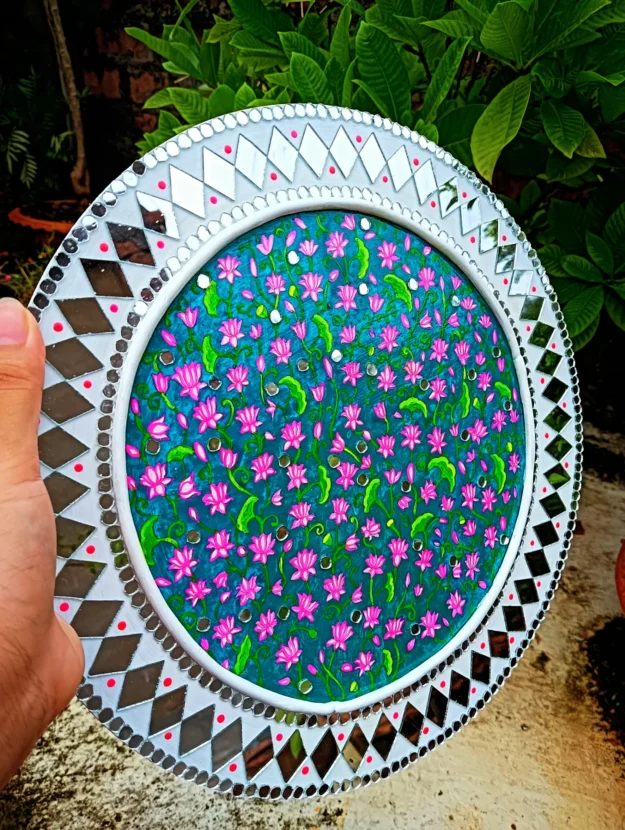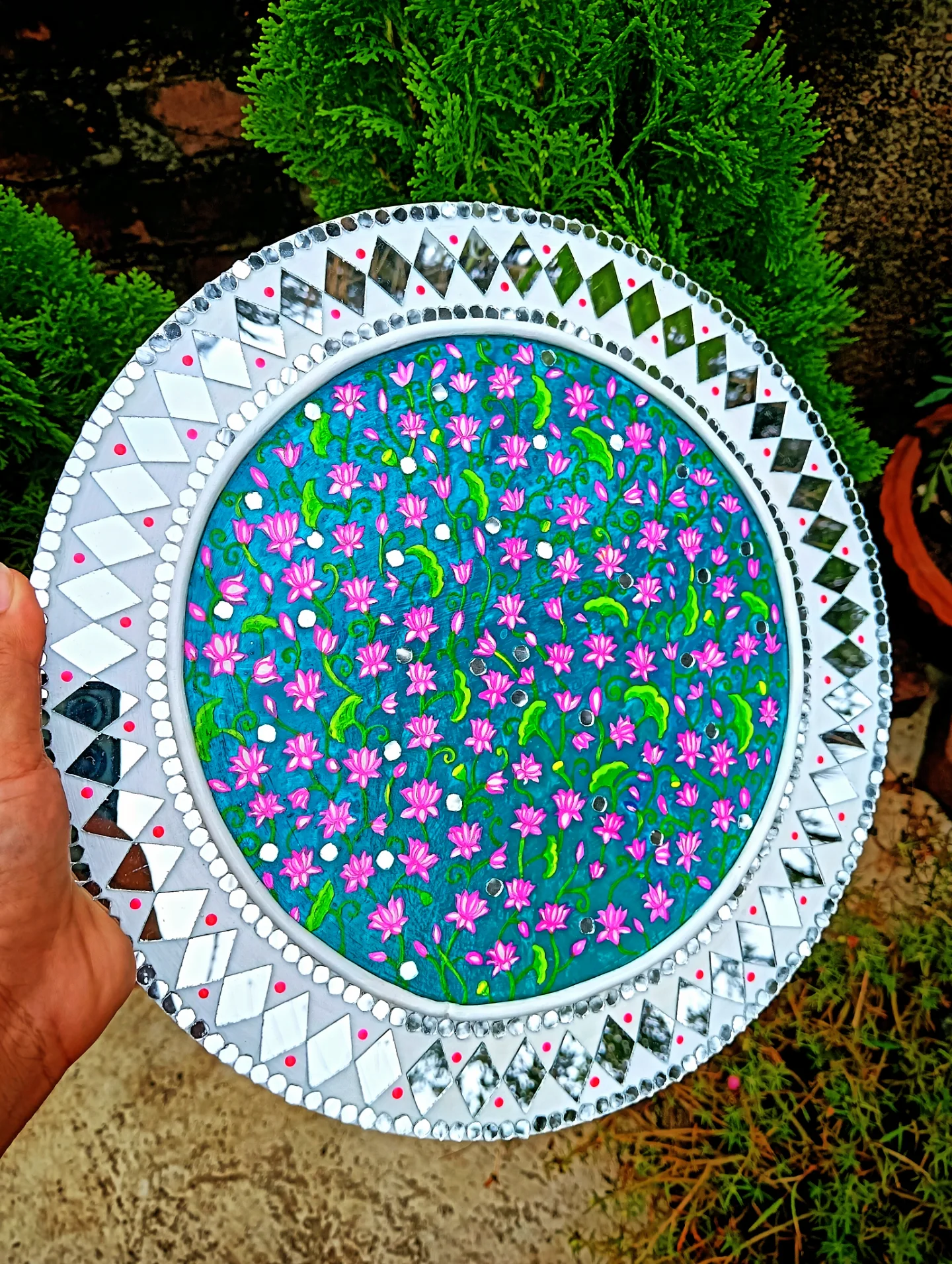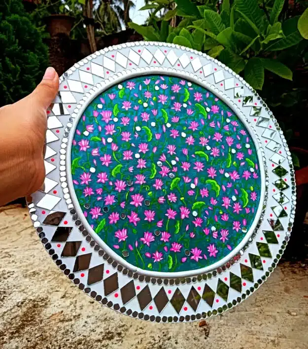 Beautifully crafted in India, this 12×12 inch wooden wall hanging features a stunning lotus design with white accents and intricate mirror work. Made from high-quality wood and painted with vibrant acrylic colors, this piece adds a touch of elegance and serenity to any room.